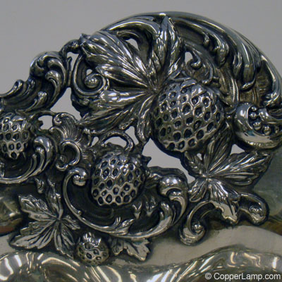 Description: Sterling, footed bowl with pierced rim and repoussed strawberries