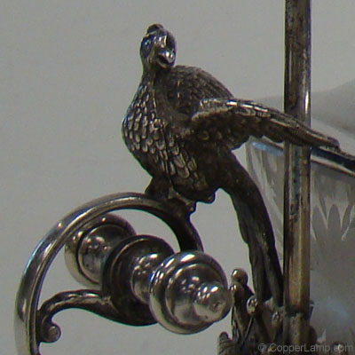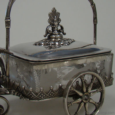 Description: Wheeled, victorian, silverplate sardine cart with cut glass liner.