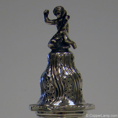 Description: Scalloped shell design sugar shaker with cherub riding a dolphin on top.