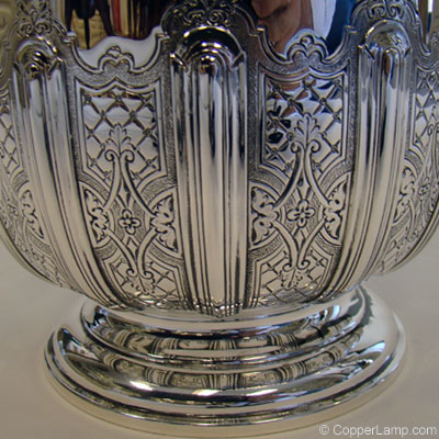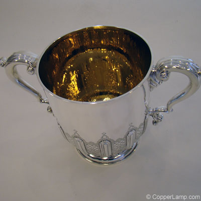 Description: Sterling, two handled champagne bucket with exceptional chasing work on the lower half of the bucket and gold washed interior.
