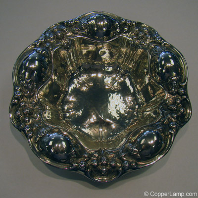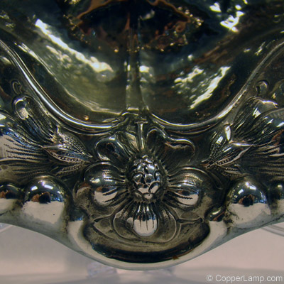 Description: Hand hammered bon bon dish with floral motif.