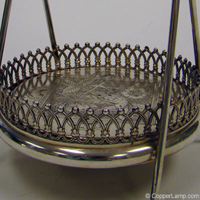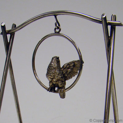 Description: Silver plated Victorian card receiver with hanging bird and engraved base.