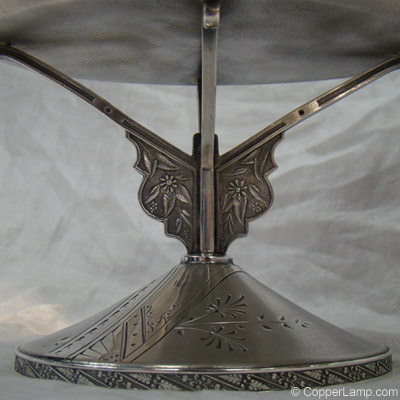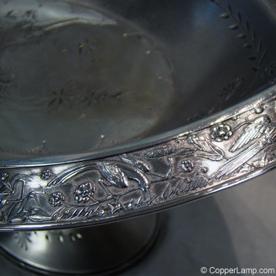 Description: Oval shaped silver plate cake basket in the Japonaise style with avian motif along the basket border.