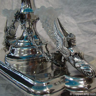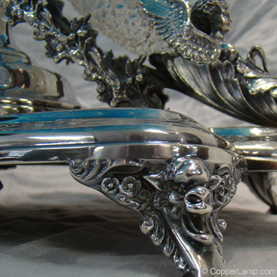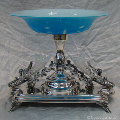 Description: Lovely Victorian centerpiece with blue and white glass bowl and white and clear hobnail glass fluted vases on the base.