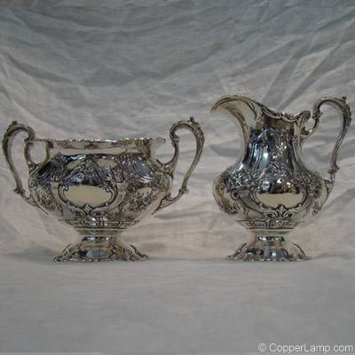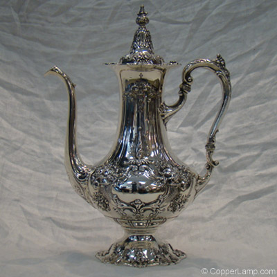 Description: Four piece sterling demi coffee set in Francis 1st with one demi coffee pot, sugar, creamer, and matching tray. Sugar and creamer are gold washed inside.